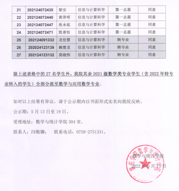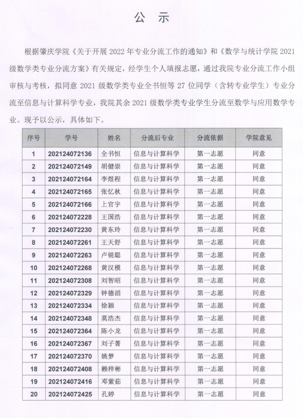 suncitygroup太阳官方网站2021级数学类专业分流结果公示
