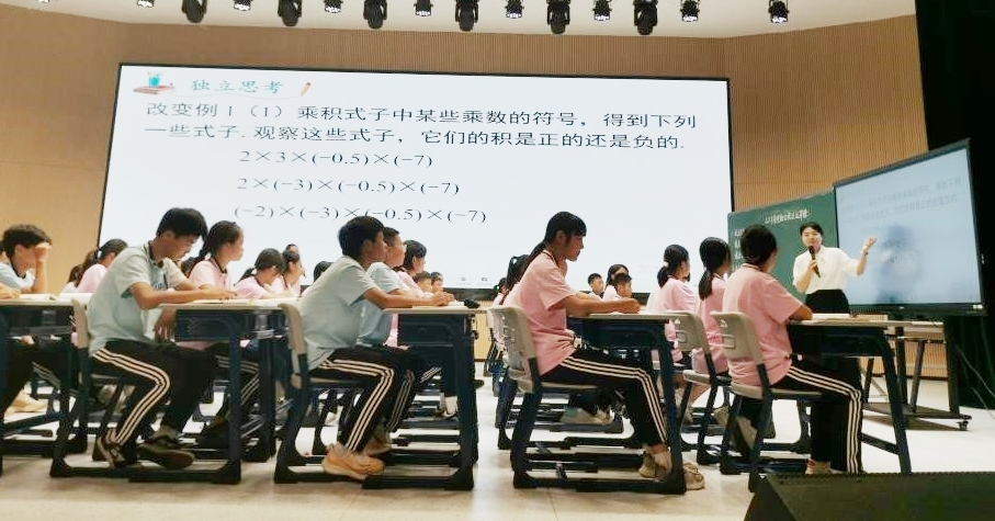 肇庆高新区育才学校青年教师白景俏系太阳官方网站2024届数学师范毕业生,她给2022级师范生带来了一节初一数学公开课《有理数乘法的运算律》。白老师现场熟练使用希沃平台,展示了小组合作、游戏教学,较好地体现了特殊到一般、分类讨论、化归、类比等数学思想方法,四基、四能、核心素养均有较好的落实。