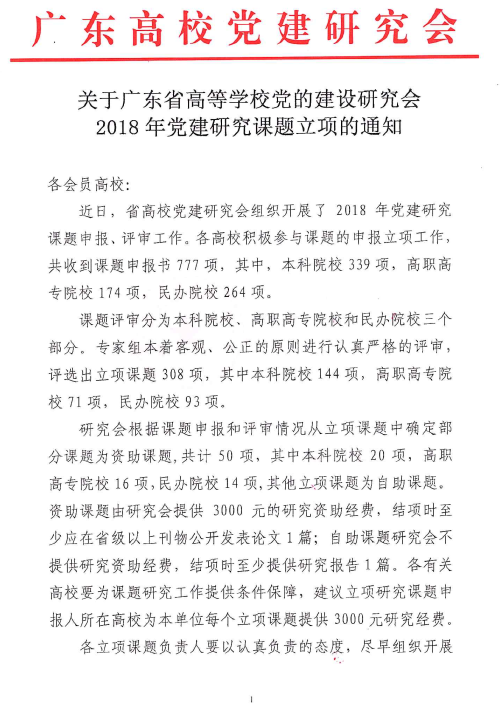 近日,广东省高校党建研究会公布了2018年全省高校党建研究课题申报评审结果,太阳官方网站党委书记杨帆主持申报的《“双培养”机制与高知群体发展党员工作研究》获2018年广东省高校党建研究会资助课题立项,是全校唯一获资助课题立项。据悉,本次课题评审分为本科院校、高职高专院校和民办院校三个部分,省高校党建研究会收到课题申报书777项,经过专家评审,共评选出立项课题308项(本科院校144项),其中资助课题共计50项(本科院校20项),其他为自助课题。