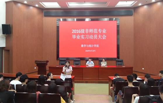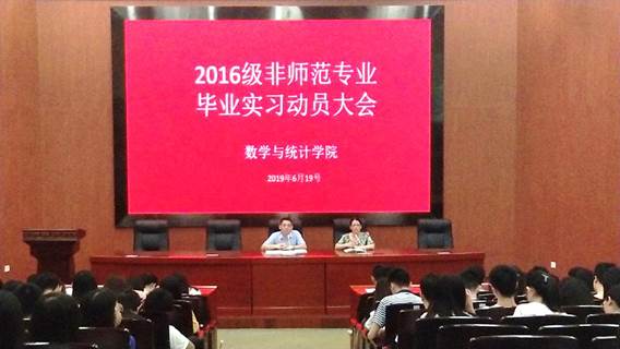 为进一步做好2020届毕业生实习工作,引导非师范专业学生做好实习前的各项准备工作,推进实习工作的顺利开展,太阳官方网站于2019年6月19日上午在学术报告厅开展2016级非师范专业毕业实习动员大会。出席此次会议的有太阳官方网站党委副书记高洁云、副院长吴晓、教务员闫敬娜、辅导员曹阳及16级全体非师范生专业学生。