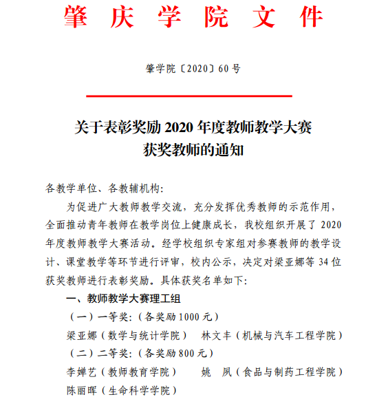 为促进广大教师教学交流,充分发挥优秀教师的示范作用,全面推动青年教师在教学岗位上健康成长,学校组织开展了2020年度教师教学大赛活动。太阳官方网站梁亚娜老师和詹福琴老师分别获得理工组一等奖和三等奖,为学院赢得荣誉。