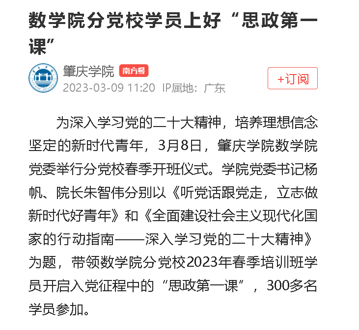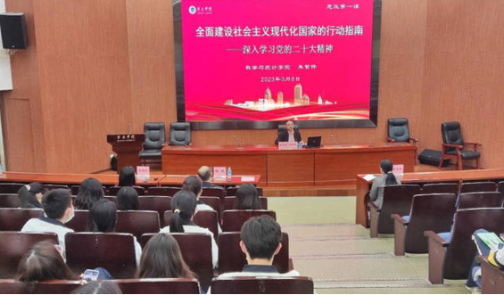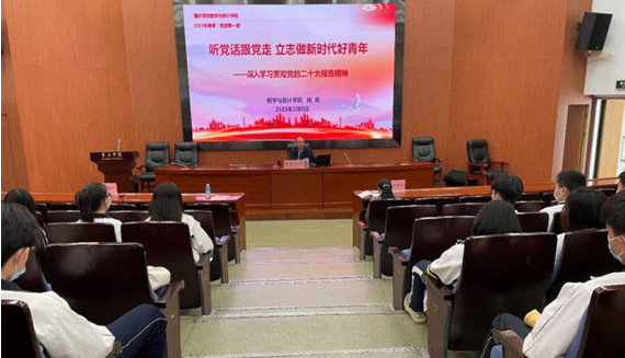 为深入学习党的二十大精神,培养理想信念坚定的新时代青年,3月8日,suncitygroup太阳官方网站数学院党委举行分党校春季开班仪式。学院党委书记杨帆、院长朱智伟分别以《听党话跟党走,立志做新时代好青年》和《全面建设社会主义现代化国家的行动指南——深入学习党的二十大精神》为题,带领数学院分党校2023年春季培训班学员开启入党征程中的“思政第一课”,300多名学员参加。