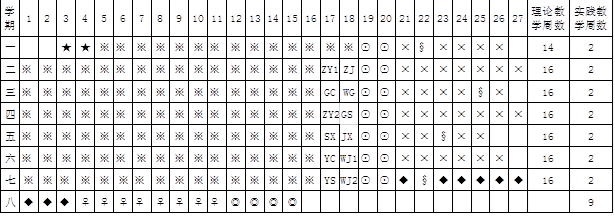符号说明:※理论教学×假期⊙考试★国防教育♀毕业论文(设计)§春节◆专业实习
