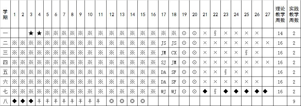 符号说明:※理论教学 ×假期 ⊙考试 ★国防教育 ♀毕业论文(设计) §春节 ◎毕业教育 ◆专业实习