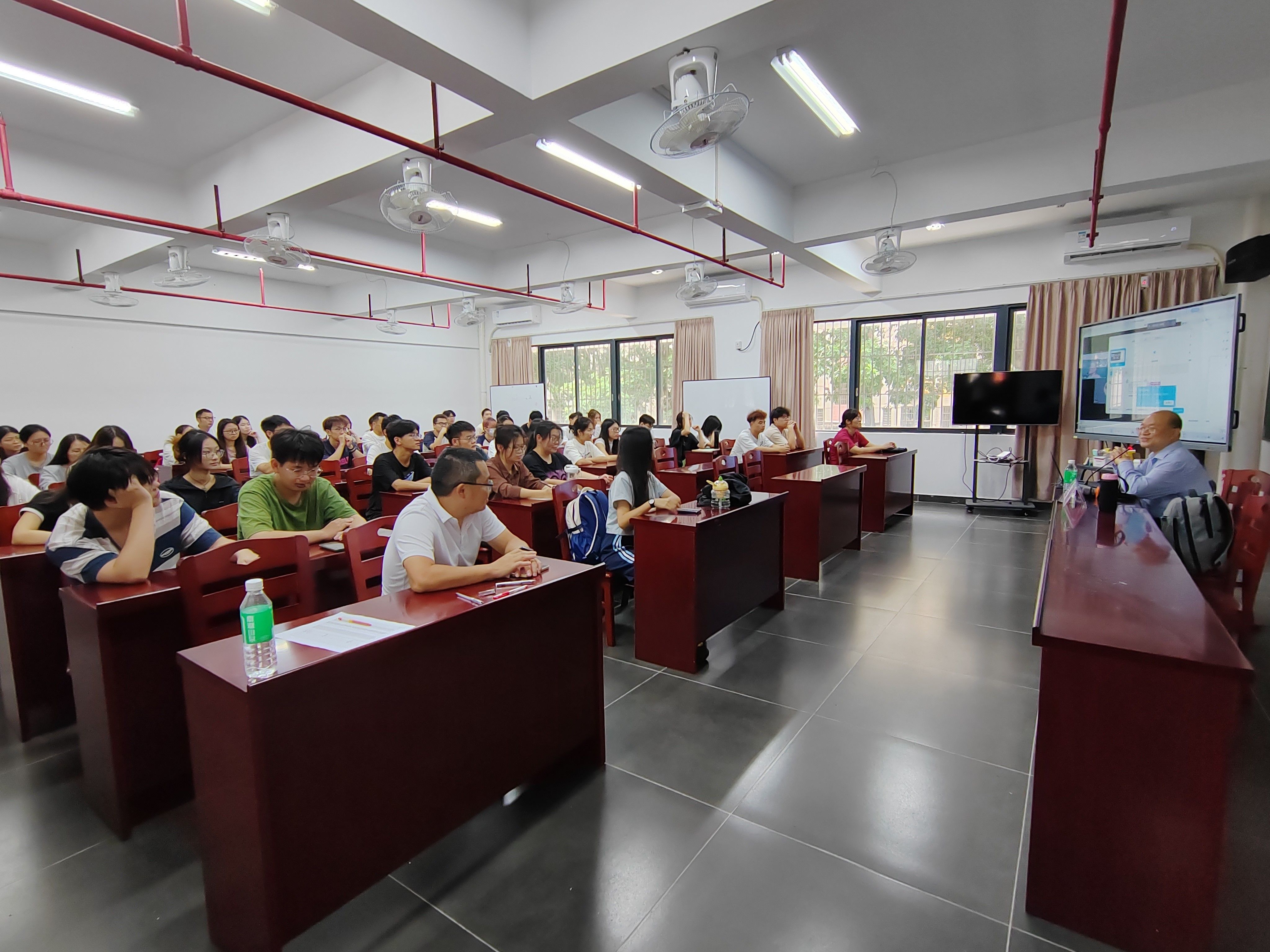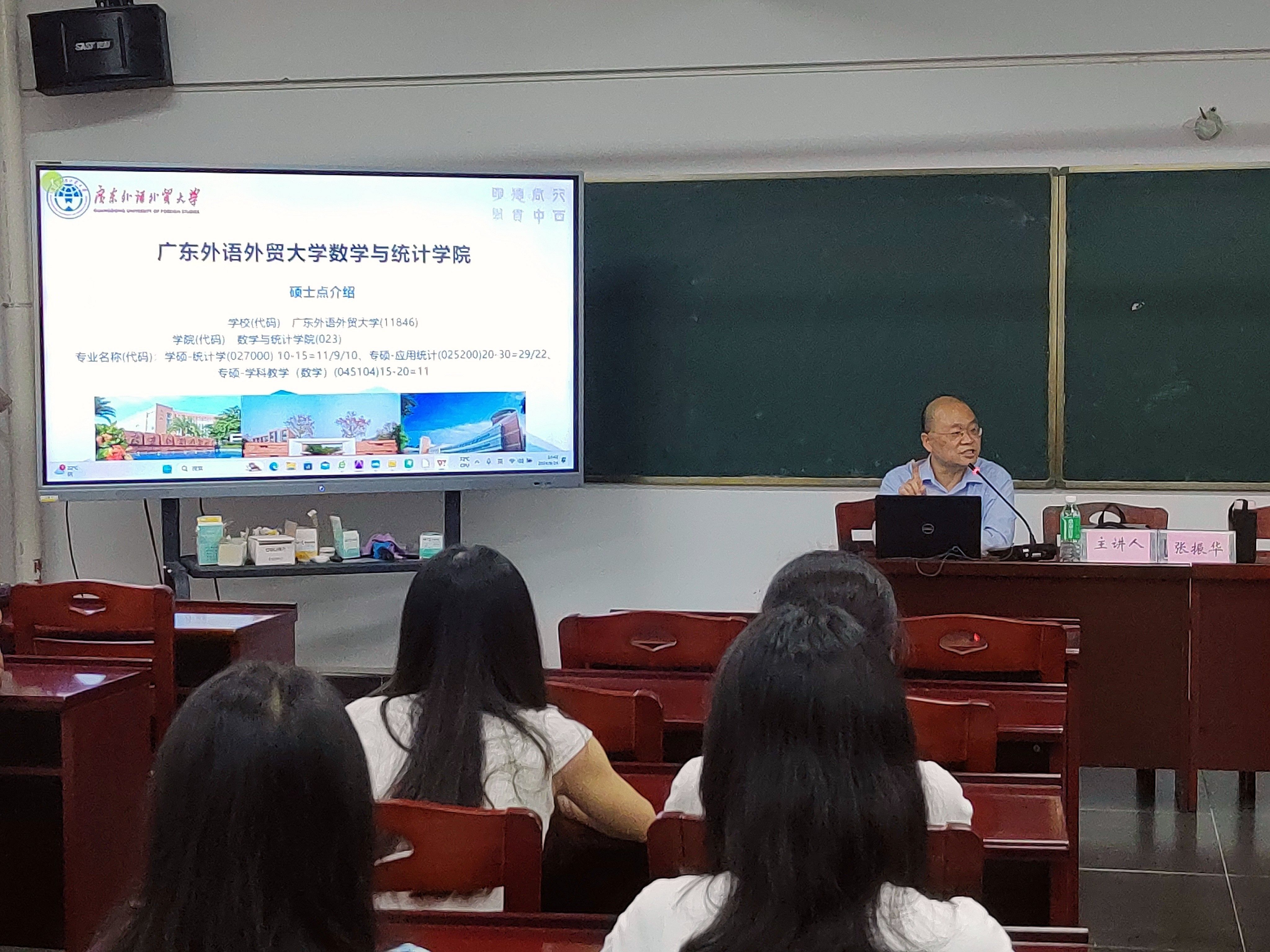 会上,张振华教授首先介绍了广外数学院的发展历程和学术成就,接着详细介绍了学院的招生专业、学习环境和师资力量,还对各个研究生项目的特点、课程设置、研究方向以及毕业生的就业前景进行了深入讲解,鼓励学生们积极申请,为自己的学术和职业发展打下坚实的基础。在宣讲会的互动环节中,学生们踊跃提问,进行了面对面的交流。就自己关心的问题进行了深入探讨,现场气氛热烈。