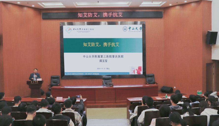 为了进一步加强学校预防艾滋病教育工作,提高学生对艾滋病的认识,减少艾滋病在大学生群体中的传播风险,2024年11月27日,校团委、学工部、校医院与中山大学附属第三医院肇庆医院共同组织举办“知艾防艾,携手抗艾”的艾滋病防治主题宣传活动。中山大学附属第三医院肇庆医院感染科主任郑玉宝教授进校开展艾滋病防治讲座。