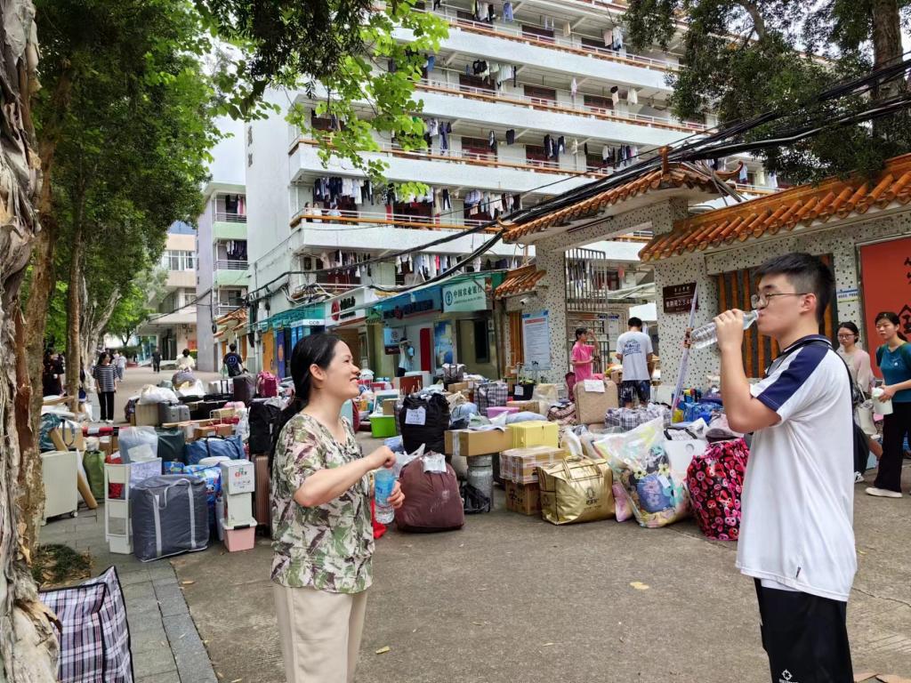 2023年7月1日早上8点,太阳官方网站搬迁工作井然有序开展。学校学工处副处长陈玉华、罗永全莅临现场指导,给学院搬迁工作具体建议和意见。学院党委副书记高洁云和学院辅导员张驰带领着志愿者和2022级学生一起搬运行李。此外,学院在搬迁定点准备了水和能量饮料,为学生及时补充水分以防中暑。志愿者分为两批服务,一批在原宿舍帮助学生搬物品下楼并将小件物品运到相应的新宿舍,志愿者进行交接,将大件物品搬上车。另一批志愿者在宿舍楼前将车上的物品卸下并运到相应宿舍。其中2022级数学与应用数学1班的王宇均对志愿活动饱含热情,即使没有报名也积极参与,他说:“我志愿,我快乐!”