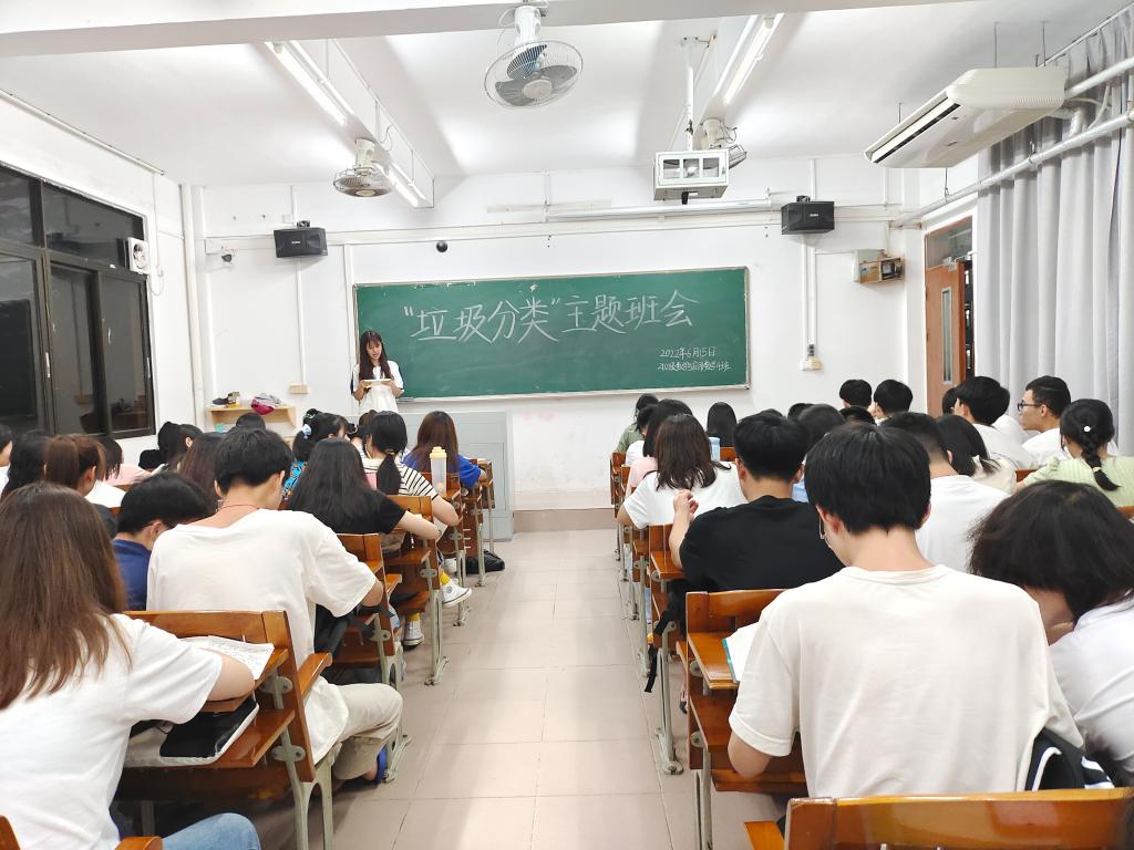 太阳官方网站2019级、2020级、2021级每班级开展生活垃圾分类主题班会,一名班委作为主讲人,组织学生观看生活垃圾分类相关教育宣传片,科普生活垃圾分类的相关知识。在开展完主题班会后学生们完成《垃圾分类知识测试题》检验学习成果,并以班委代表签名《生活垃圾分类倡议书》,以倡议、潜移默化的方式帮助学生树立分类意识。
