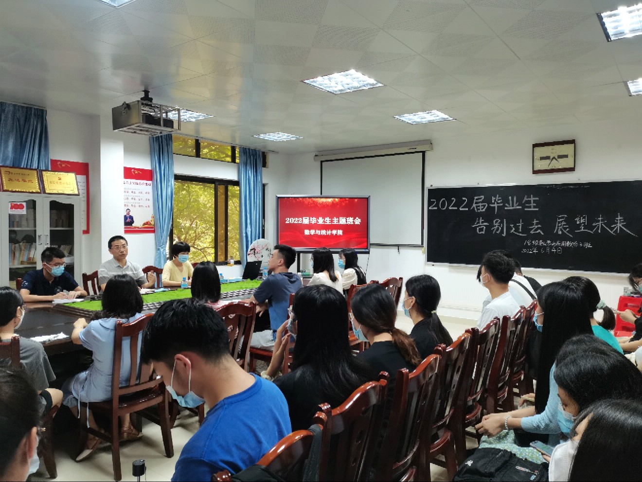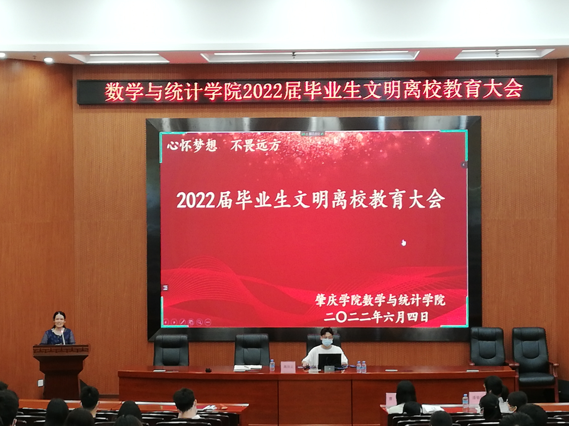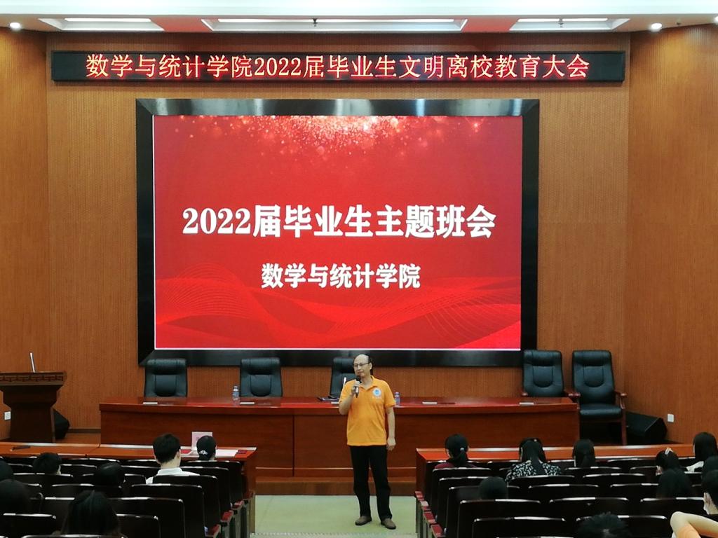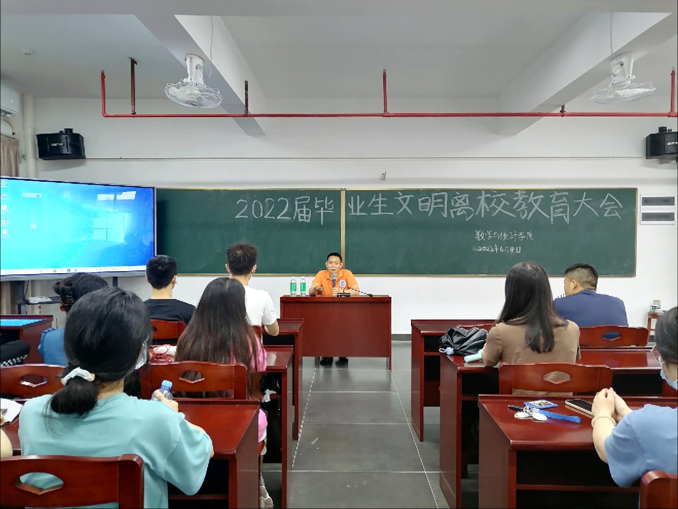 为做好毕业生文明离校教育工作,营造和谐温馨的毕业氛围,2022年6月4日下午,数学院在学术报告厅、实训中心214、215和学院会议室308采取线上线下方式,召开了毕业生离校教育大会和主题班会。出席本次会议的人员有学院党委书记杨帆、学院院长朱智伟、党委副书记高洁云、学院副院长符和满、吴晓、辅导员曹阳、潘敏仪、张驰,以及2022届全体毕业生。