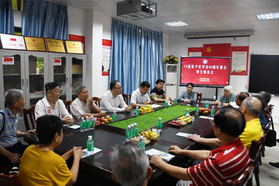 5月19日上午,数学系74届校友毕业50周年座谈会在数学院308会议室举行。学校党委委员、宣传统战部部长陈前、数学院党委书记李先强、副书记高洁云、校友办副主任陈林君和50余位校友等参加了座谈会。座谈会由李先强主持。